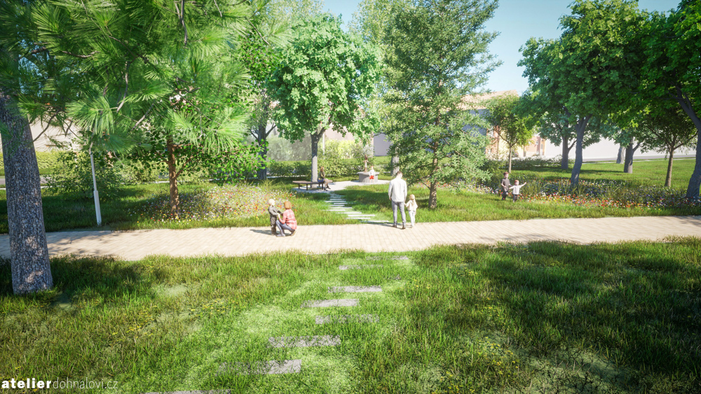 V parku právě začala další fáze jeho postupné obnovy. Redukce již nefunkčních chodníků a založení nových - s mlatovým povrchem, vznik nových pobytových míst, nový mobiliář... Ne všechno je možné realizovat hned teď, a proto jednou z dalších vizí do budoucna je také vytvoření pobytového místa u studny, spojené se založením travnaté kvetoucí plochy na místě současného dlážděného půlkruhu.