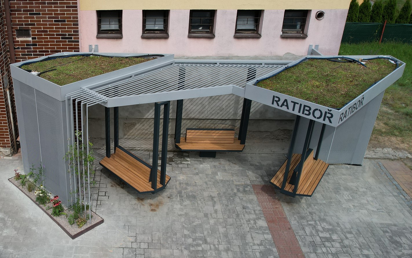 Spolupracovali jsme na návrhu a realizaci PRVNÍ BIOKLIMATICKÉ AUTOBUSOVÉ ZASTÁVKY v České republice, v obci Ratiboř (Zlínský kraj). Pojem "bioklimatická" není jen marketingovým označením, ale reálným obsahem. Funguje na principu aktivního chlazení vodou, rostlinami a stíněním.